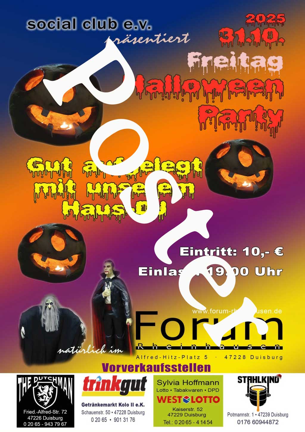 dieses Jahr gibt's bei uns nur eine Halloween-Party, da wir eine Woche vorher die "Rocknight with friends" veranstalten. Für kalte Getränke zu gewohnt moderaten Preisen wird gesorgt. Eine Verkleidung ist wie immer gewünscht, aber kein “MUSS”. Die Dosenmucke übernehmen unsere Haus-DJ' s. Der Karten-Vorverkauf startet am Samstag den 28. September 2024. Euer forum-rheinhausen.de Team |