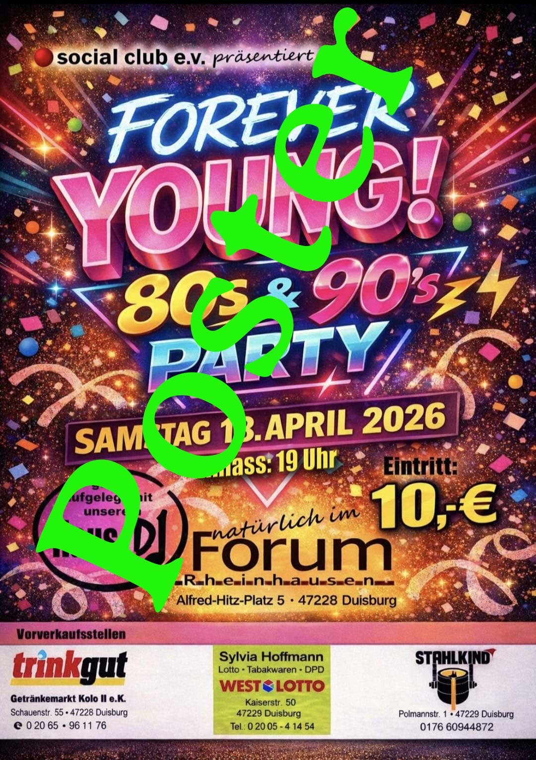 Hallo liebe Freunde des forum-rheinhausen, das ist mal eine andere Party. Unsere DJs werden Mukke spielen mit der wir (langsam) erwachsen wurden... Der KVV beginnt am 21. März 2026 Bitte bezahlt die Eintrittakarten immer in bar da Kartenzahlung in den VVK-Stellen nicht möglich ist. Euer forum-rheinhausen.de Team |